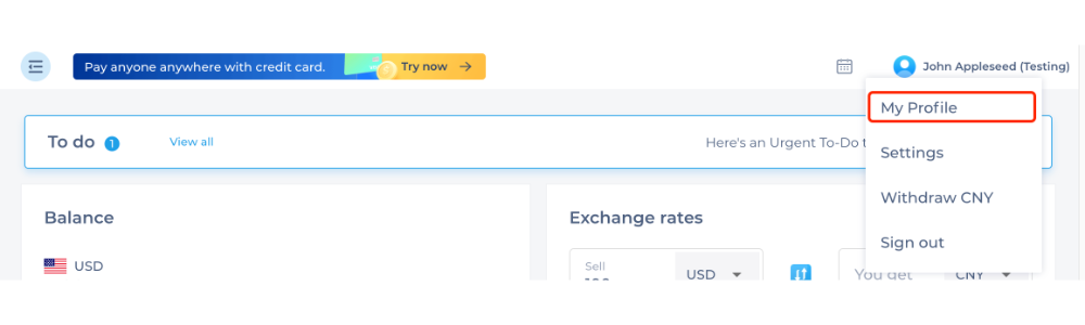 Step 1: Log in to your PingPong and select the “To-do list” on the Dashboard page OR select My Profile. you’ll be directed to the business verification page.